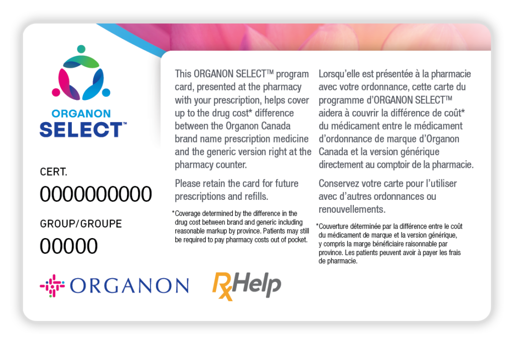 You can get your ORGANON SELECTTM Program card by calling 1-866-RxHelp4 (1-866-794-3574). When filling your prescription at the pharmacy, simply present your card for immediate payment assistance*†. Program available for select brands only.